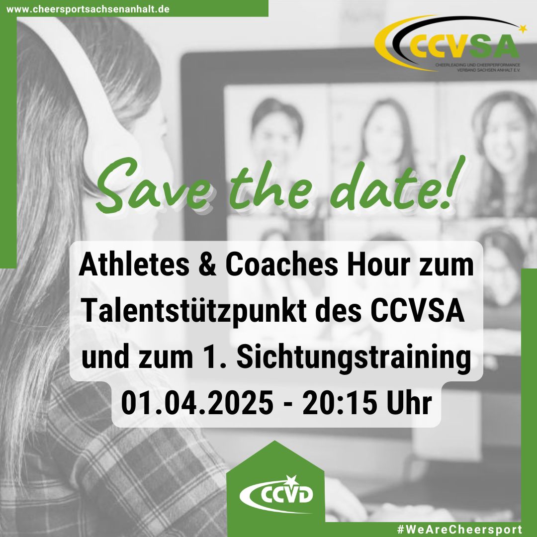 Die Athletes & Coaches Hour findet am 01.04.2025 um 20:15 Uhr digital über den CCVD Campus statt. Der Link zum Meetingraum wird an alle angemeldeten Teilnehmer*innen kurz vorher per Mail verschickt.